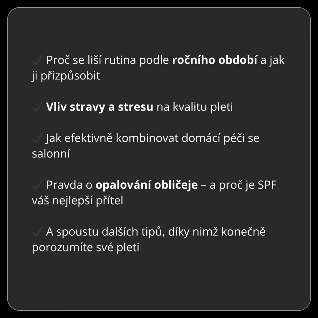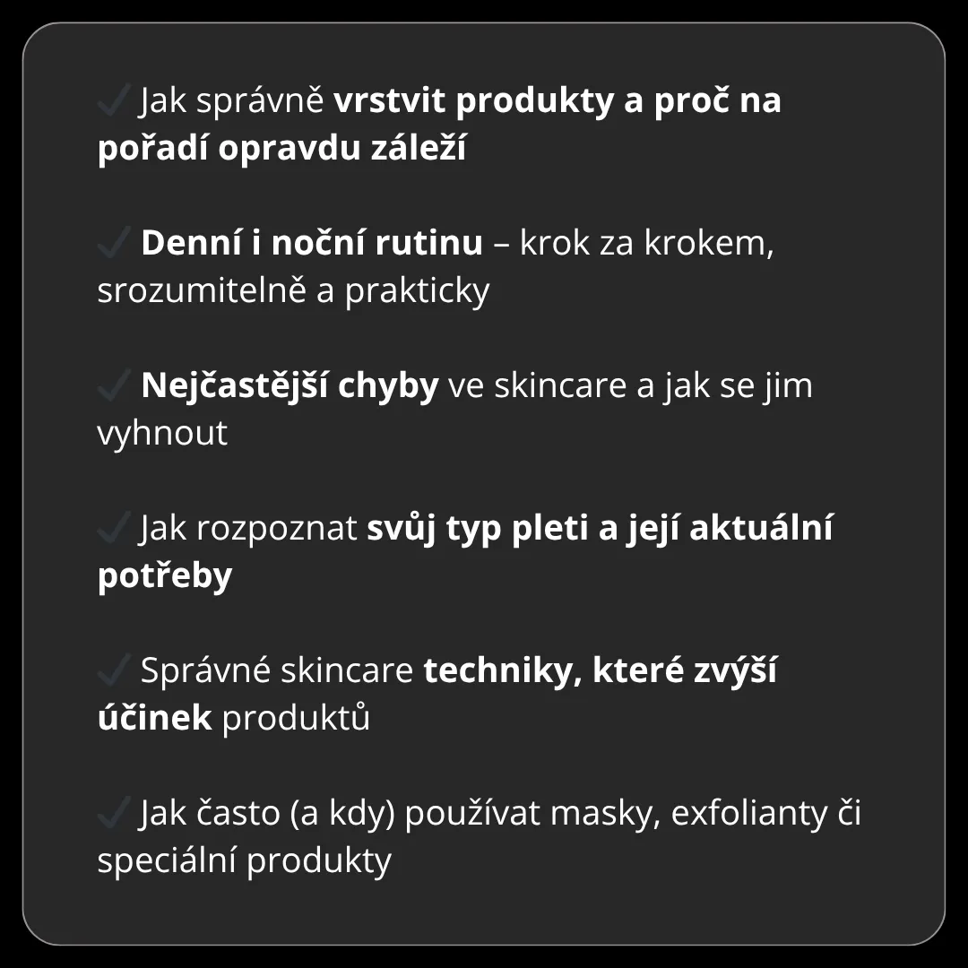 Už žádné hádání, který produkt patří první, co se s čím nesmí kombinovat a proč vaše pleť pořád vypadá mdle, i když používáte dražší kosmetiku. V kurzu dostanete jasný postup, který funguje.