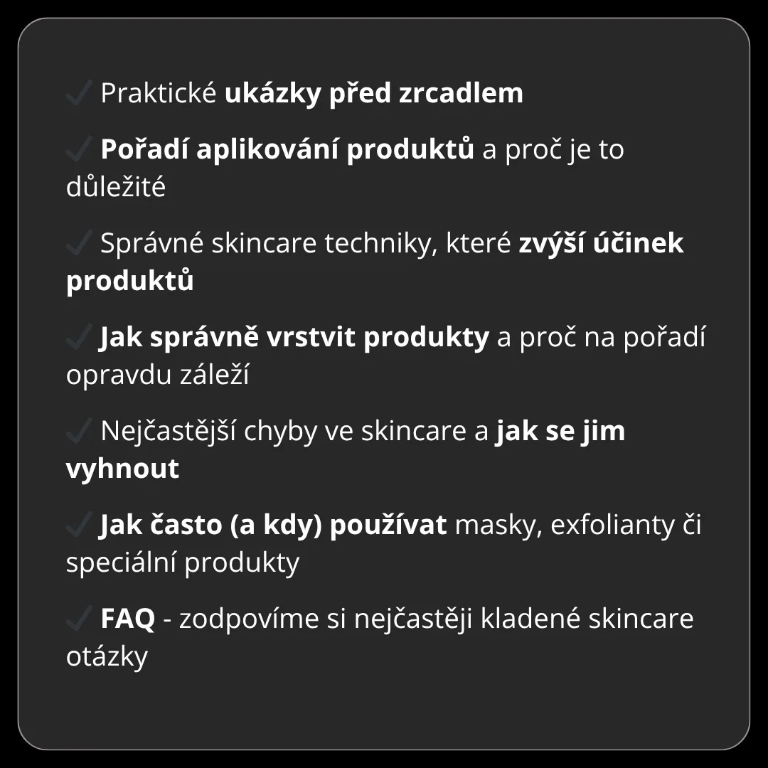 V tomto kurzu vás krok za krokem naučím techniky, díky nimž vaše skincare rutina přinese viditelné výsledky.